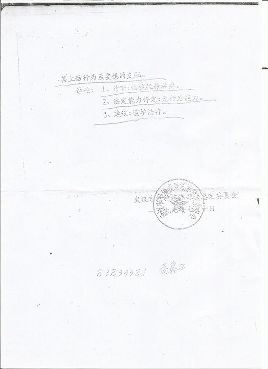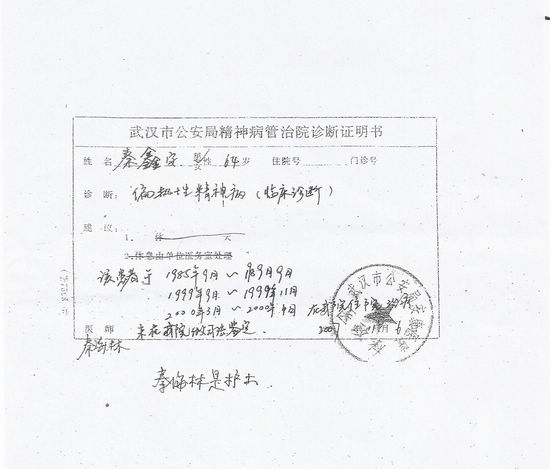2007年11月6日又被武汉市公安局精神病管制院诊断为“偏执性精神病 ”。