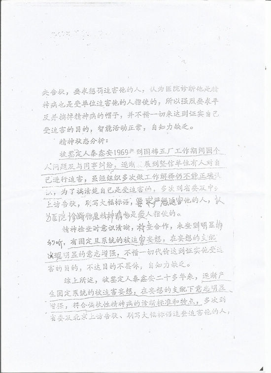 秦鑫安说,按照他们的说法,他们是不是也“偏执”?那么多的医学理论和法律依据摆在那他们不执行,非要自出一套,试图用这种残害人的手段达到压制民意的目的,他们不但“偏执”,还有“妄想型精神分裂症”。他希望有关部门对这些病入膏肓的不法之徒及时收治,不要在让他们危害社会,危害人民!