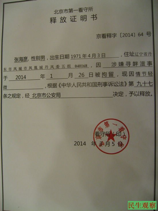 张海彦:是我们老家辽宁省凤城市凤凰区公安分局,这次关押没有通知我们家人,这已经是第二次关了,上一次关押的时候,就给我做假鉴定,说我有精神病,其实我没有。
