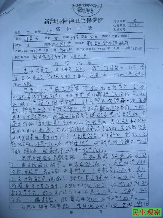 为拿一纸交通事故处理书 四川周素芳七次被关精神病院