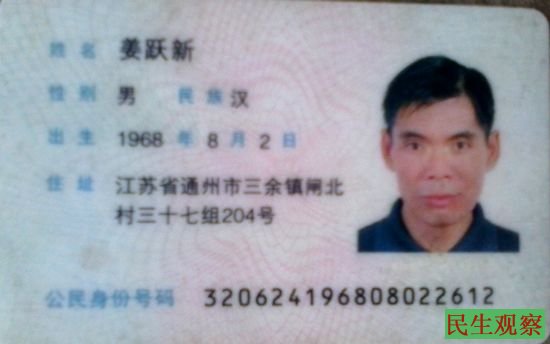 姜跃新,男,今年47岁,住江苏省通州市三余镇闸北村三十七组204号。说起他举报的经历时他有些沮丧,因为他举报被两次关进精神病院,第一次关进精神病院是2009年3月25日,到当年的6月2日获释。当时,他和老婆赵卫娟一起去天安门,被北京警察抓到天安门分局,后被镇政府和村领导从天安门分局接出来,限制了4天自由,让他老婆回了家,结果他被送到大丰市第二人民医院(精神病医院)进行强制治疗。