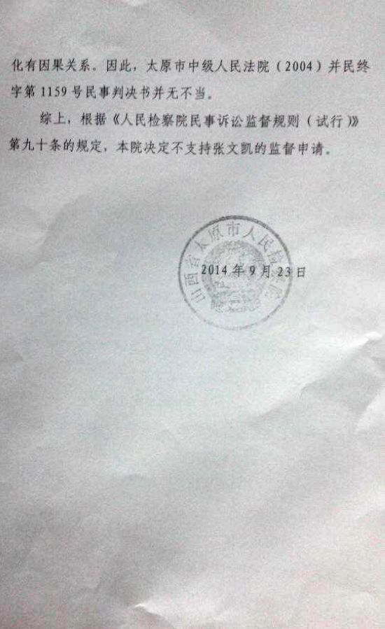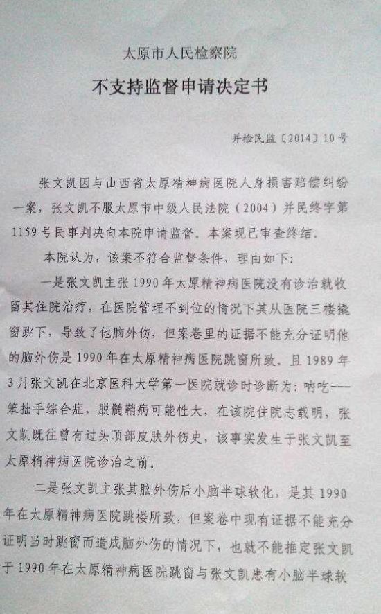 为了讨回公道,2003年张文凯起诉至太原市迎泽区人民法院,要求太原市精神病院承担没有精神病而把他当精神病治疗和他被迫跳窗逃走造成的脑外伤人身损害赔偿,并为其恢复名誉。迎泽区人民法院以超过诉讼时效、是其父送诊,跳窗逃走导致现在患小脑半球软化证据不足为由驳回了张文凯的诉讼请求。张文凯不服判决上诉到太原市中级人民法院后,太原市中级人民法院以没有充分证据证明当时跳窗逃走和现在患小脑半球软化有因果关系,故维持原判决。经过几次上诉,申诉被维持后,2014年,张文凯找到了太原市人民检察院要求监督法院依法审理,太原市检察院却以原判决并无不当为由,对张文凯的监督申请不予支持。