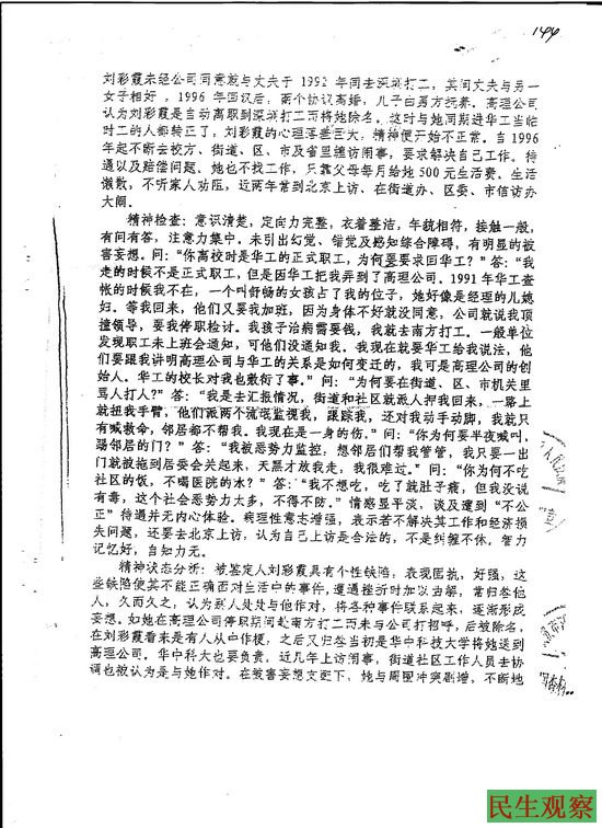 因为劳动纠纷,具有干部身份,会计师资格的刘彩霞,2008年4月14日被武汉市精神病医院鉴定为偏执性精神障碍,先后7次被武汉警方送到精神病院接受强制治疗。在“治疗”的过程中,刘彩霞患了严重的妇科疾病,她多次要求治疗,医院称没有这项经费,在家人一次次的努力下,她才离开那个让她生不如死的“魔窟”。