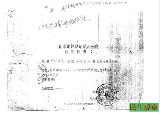 河北被精神病访民刘艳娥,是本刊见到的为数不多的被摘除精神病帽子的“精神病患者”。刘艳娥说,是她在精神病医院写下的一份长达10页,题为《一场冤案的始末》的上访材料打动了精神病院的大夫和院长,最终在被强制治疗18天后,医院以“经检查未见精神异常”的一份检查结果,结束了她的被精神病生活。