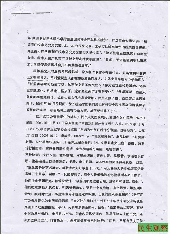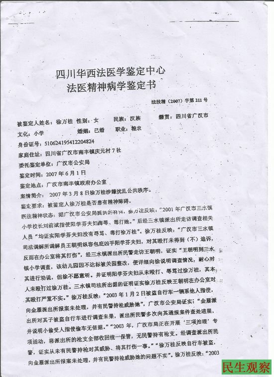 所幸这的大夫并没给她用药,还告诉她你要告就告给你做鉴定的人,给我们没关系。徐万桂这才知道了原来在镇上问她奇怪问题的是四川华西法医学精神病鉴定中心的大夫。