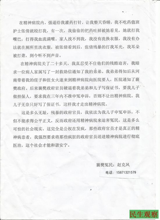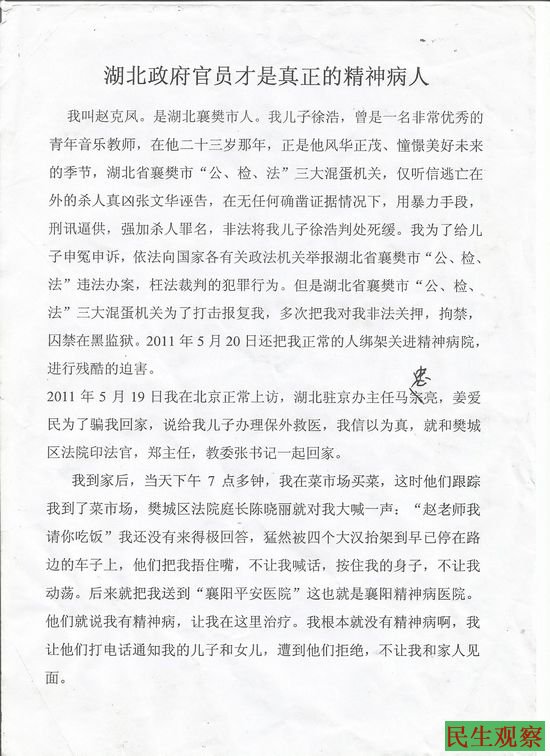 出来后,她在申诉状上写道——这是多么无耻,残暴的政府官员,我依法为儿子申冤申诉,不但不能求得公平正义,反而政府还用精神病院来迫害冤民,这是多么可怕的社会现实,这完全是公权在发疯,那些政府官员才是真正的精神病患者,我强烈要求将那些疯狂的政府官员送进精神病院进行彻底医治,这个社会才能和谐安宁。