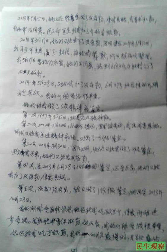 进入病区后发现,54岁至今未婚的姜和娥像个犯人一样被禁锢与封闭严密的住院部的六楼。她脸色苍白,身材有点臃肿,和她交谈发现,她说话流畅。她告诉我们她和其她精神病患者一样每天被迫做4个小时的手工活,每天被迫吃3、4片精神类药物,晚上还要吃一颗安眠片,有时打针,还把她绑起来用过电针,她用手比着,3根电针是分别扎在脑门和太阳穴上的。由于长期的药物作用,现在她离开安眠药根本睡不着。