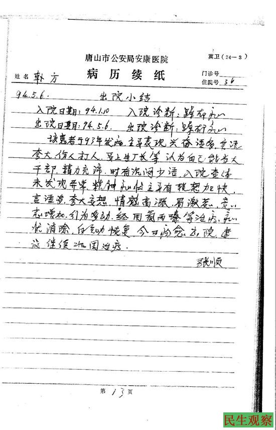 韩方:是1994年的1月10号把我送进医院的。我的工友郑金满从死亡到下葬也就20来天时间,他下葬后我找齐国良说的这话。齐国良就不让我上班了,让我天天到厂里报到就行。这样坚持了一个星期吧,1月10号我又到厂里找齐国良报到,他说让我到医院检查一下看我有没有病。公安处保卫科的胡贺秋、厂武装部的王凯胜用厂里的车把我送到唐钢医院精神科检查。梁尔文大夫问我有什么病,我说我没病,就是给厂里提意见,你没看有两杆枪押着,他们一个是保卫科,一个是武装部的。结果检查完就把我送到了唐山市公安局安康医院。