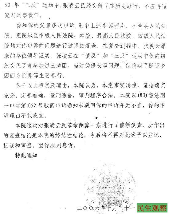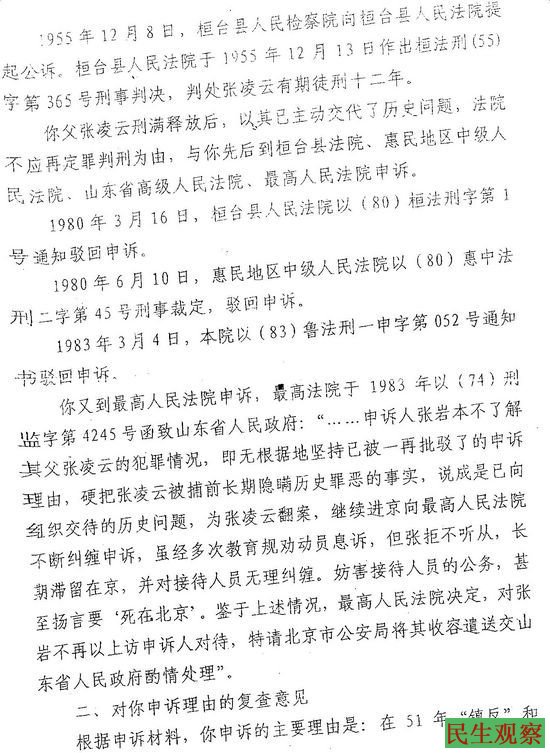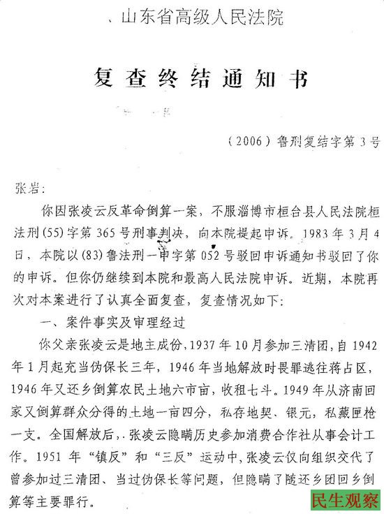 但是,1955年,张凌云被以“反革命倒算罪”判处有期徒刑12年,1960年冬张凌云因犯心脏病,双手冻伤,右手冻残,1962年获监外执行。回原籍后又被桓台县公安局戴上了“地主分子”的帽子,文革期间受尽摧残和折磨。张凌云一直不服强加的罪名,1973年开始向上级申诉。由于张凌云病重,1982年起委托其子张岩为父伸冤。至今申诉没有一个结果,张凌云含恨而终,而张岩也屡遭迫害。