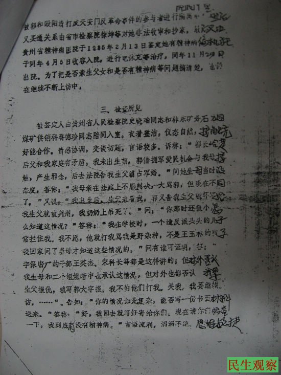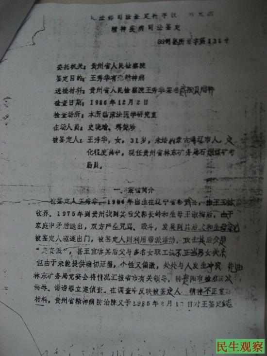 出来后,王秀华到北京去上访,得到了最高人民检查院的一些领导的重视,1986年初,司法部法医鉴定科学技术研究所从新做了精神病鉴定,终于推翻了贵州省给的精神病鉴定,给了一个“偏执性格”的说法。面对这个结果,王秀华说“我都被你们关在医院了,我能不激动吗,是不是?其实他们这个结果还是偏向于贵州政府,因为在我被带去司法部鉴定的时候,检察院的人拿了一个文件,里面是介绍我的情况的,因为既然我是被迫害的,肯定是有人要承担这个责任。”