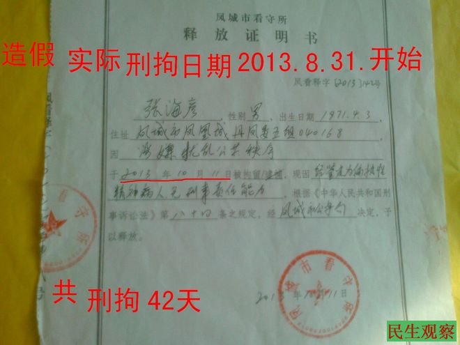 张海彦:9月26日那次“鉴定”,当时没有人告诉我“鉴定”结果,直到我离开看守所时,我的释放证上写我经鉴定为“偏执性精神病”,无刑事行为能力,予以释放。我被送进凤城第四医院后,医院里面的医生也说我是“偏执性精神病”,但我至今没看到鉴定书。我今天刚去了凤凰城公安分局,我要鉴定书,我的妹妹也在找他们要鉴定结果。