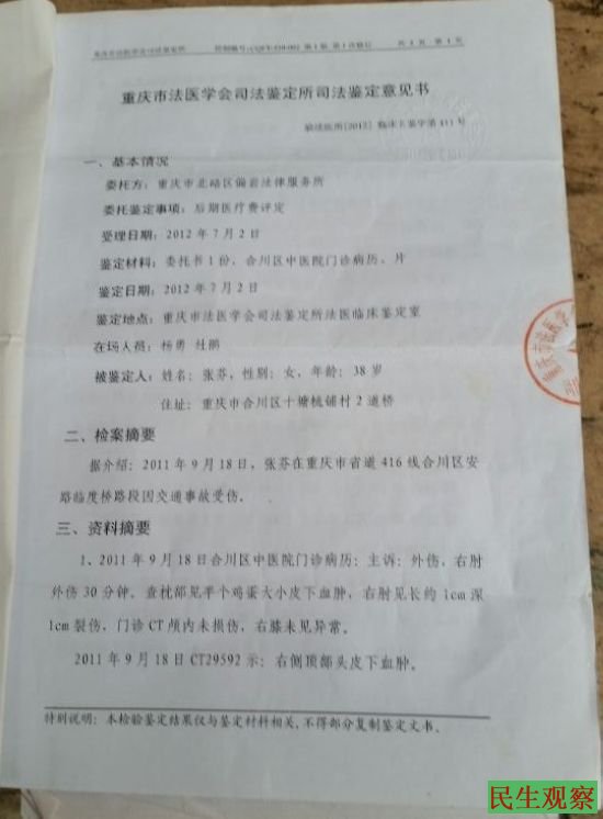 2011年9月18日的早上,张芬走在街上被风驰电掣而来的一辆摩托车撞倒,车主谢尤军并没有报警,只带张芬到医院做了简单的检查。心底厚道的张芬并没有多想,认为皮外伤过几天就好了,便自行回家。其后张芬连续多日腰痛难忍,到医院检查发现,她的骶椎隐性脊柱破裂。认识到事态的严重后,张芬忍着疼痛赶到合川区交通巡逻支队去报案,交警也做出了谢尤军对此交通事故负全责的事故认定书。