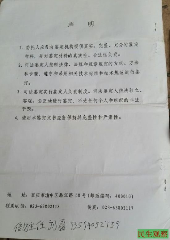 11月4日早上,付小兰和铜溪镇派出所的5人又把她强制送到重庆市第一精神病院做鉴定,做了脑电图,下午一男一女两个人问她,“中南海有人接谈没有,钱从哪来等等和上访有关的问题”问完后又把她送回拘留所。11月5日,铜溪镇派出所民警让她在鉴定书上签字,张芬坚持不签,对方没在多说把张芬释放回家。