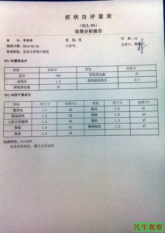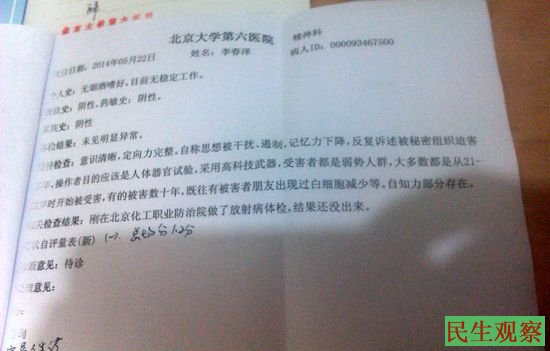 事后,他在文中写到,任何一个脑控受害者都可能被当作“精神病患者”看待,任何一个“脑控”受害者都可能被强制关进精神病医院!“被精神病”已经成为掩盖“脑控”犯罪真相的巨大社会黑幕!并到北京大学第六医院精神科做了各项检查,检察结果均未见异常。