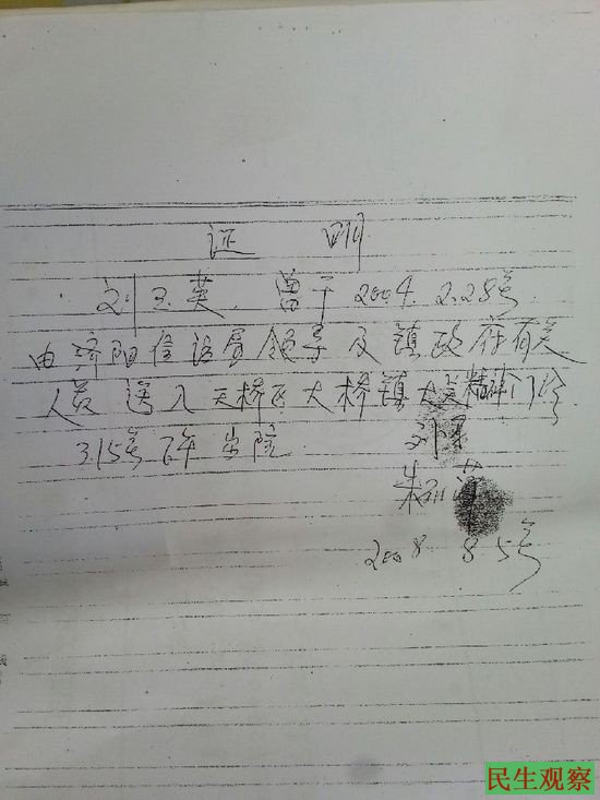 到医院大夫很爽快的就把她收下,也没给她检查就关进病房,直到3月15日送她去的人才把她接出来。这期间她家人并不知情。刘玉英说,“这是个私人医院,就是朱小萍和刘军他两口子开的,好在他们有点人性,没给我用药”。在刘玉英的儿子马平怀的央求下,2008年8月5日朱小萍开具了一份刘玉英曾经住院的证明。