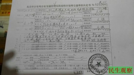 而医疗费全部自己交,这还不算,皇姑区公安局和辽河派出所为了摆脱责任,派人到医院给高靖春送一张假的交通事故责任认定书。在受伤人签字一栏把她和民警刘实的亲笔签字全部删掉了。当她儿子拿着这个责任认定书找到处理此案的北京市东城区交通支队天坛大队时,才知道皇姑区公安分局给的交通事故责任认定书是无效的。天坛大队的民警非常认真、负责任的給了一份真实的、上面带有她和民警刘实的亲笔签字。