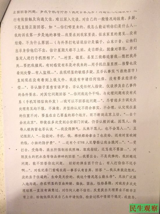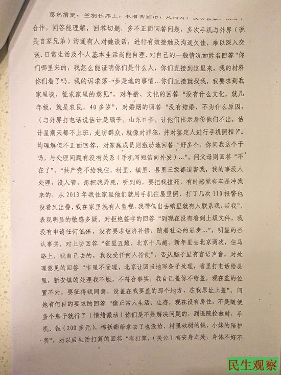 出来后又因为上访2015年7月7日把她关在了旅馆,7月12日说是信访局的人来给她谈话,后来才说是精神病院的医生,她问医生“你们有什么依据说我有精神病”,医生说会有科学依据的。