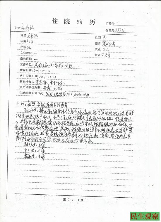 说起高彩绪的出院,还有许多的曲折。原来在他被关进精神病院的第二天,他的妻子孙永芹见他拘留期满没有回家就到公安分局要人,事后于10月16日公安分局闯到孙永芹家里绑架她,临近产期的儿媳上前阻拦被毒打,最终孙永芹也被绑架到了黑龙江省农垦总局精神病防治院。