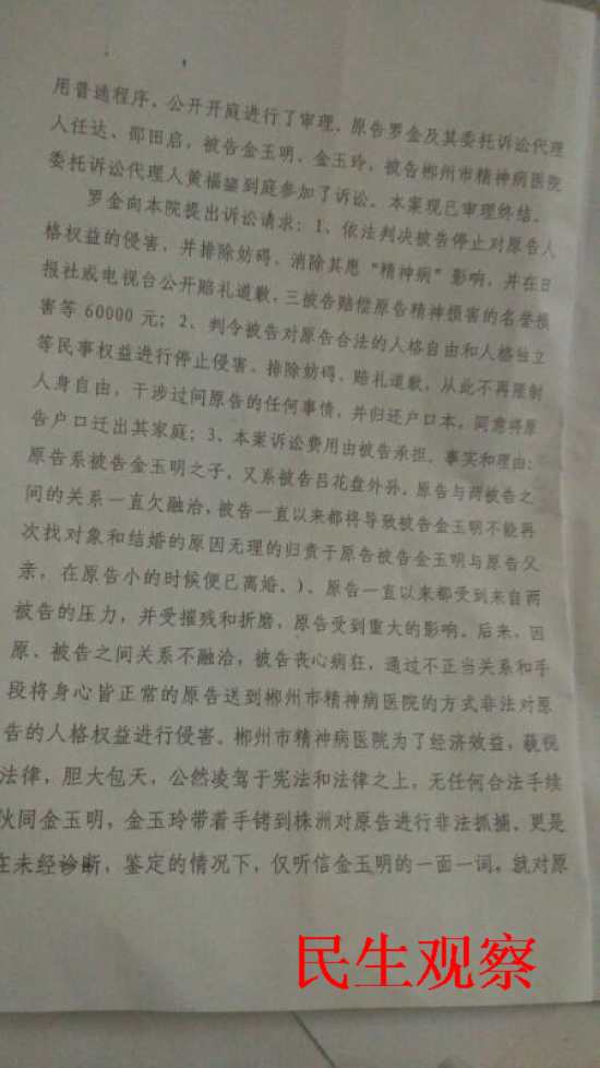“《精神卫生法》颁布以后,其实并没有什么样的改观一点儿都没有,在全国来说基本上没有任何的改观,所谓的法律并不是万能的,关键是执行如果执行标准到位合宜的话再轻的法律能起到效果。若执行完全不到位,那也没有办法,一纸空文”。在庭审将近一个月后小罗对本刊志愿者说了以上感慨。随后又略带自豪的说:“自从我的案子去年10月在郴州市首次立了案之后,从去年10月份开始,他(郴州市精神病医院)从网站上公布说他们不再出诊了,如果出诊要跟110配合”。”说明你这个事还是有一些效果”?“对,对我这个是郴州市是首例”。