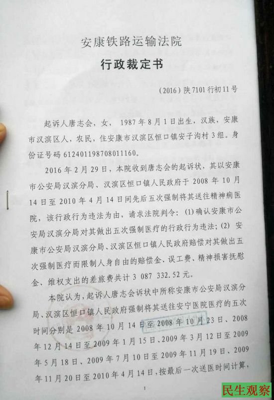 2016年2月29日她起诉到了安康铁路运输法院,要求确认汉滨分局对她做出的5次强制医疗的行政行为违法,并由汉滨分局和恒口镇政府共同赔偿她的经济损失及精神损害抚慰金共计30余万元。