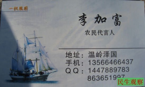 到底写了什么,让这些人在光天化日下实施绑架,记者通过李家富提供的链接在网上搜到,第一篇说的是他自己这些年上访告状的始末及被迫害史,第二篇文章中谈到“农民实在太苦太穷了,我温岭农民种粮食,按最高箅[无台风、无水灾、无旱灾]早稻800斤、晚稻1000斤、单季稻1300斤,减去拖拉机费,耕120元,收120元,化肥120元,农药130元,单季稻加倍,还种子,尼龙薄模等,不计人工费,还剩多小,就是我们农民一年收入。而中央给农业补贴250--800元一亩,我们农民不谢天吗?可惜啊可惜,我们农民高兴得太早了,我们温岭是人多地小的县级市,人均土地不到半亩,一个农民,一个家,能种多小地,我可以说,最多只能种5--10亩,多种,地在那里?