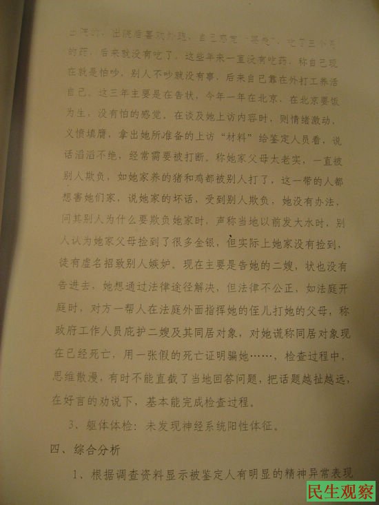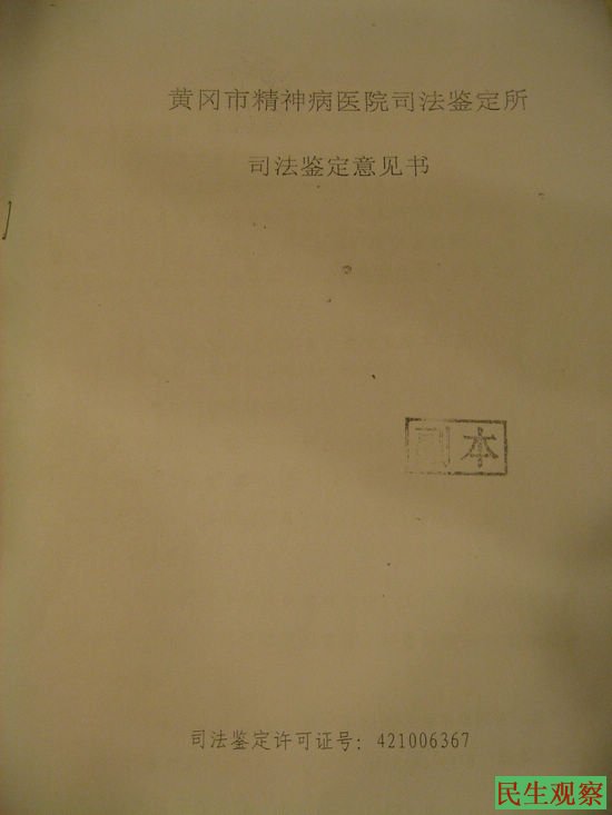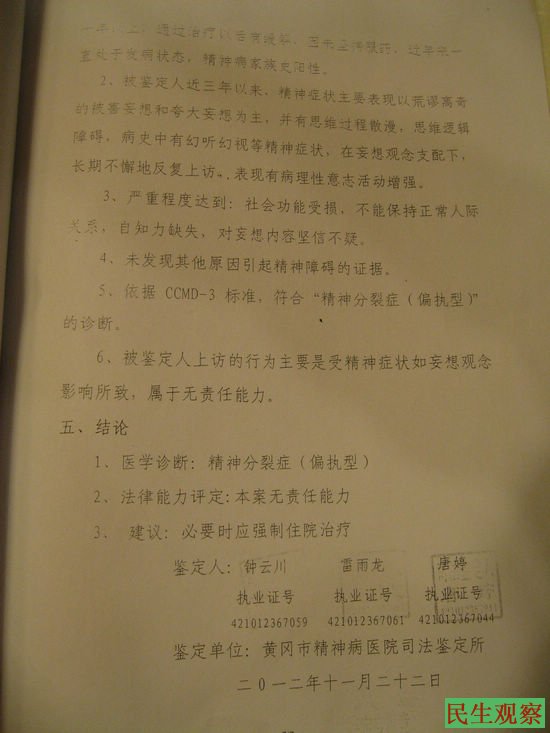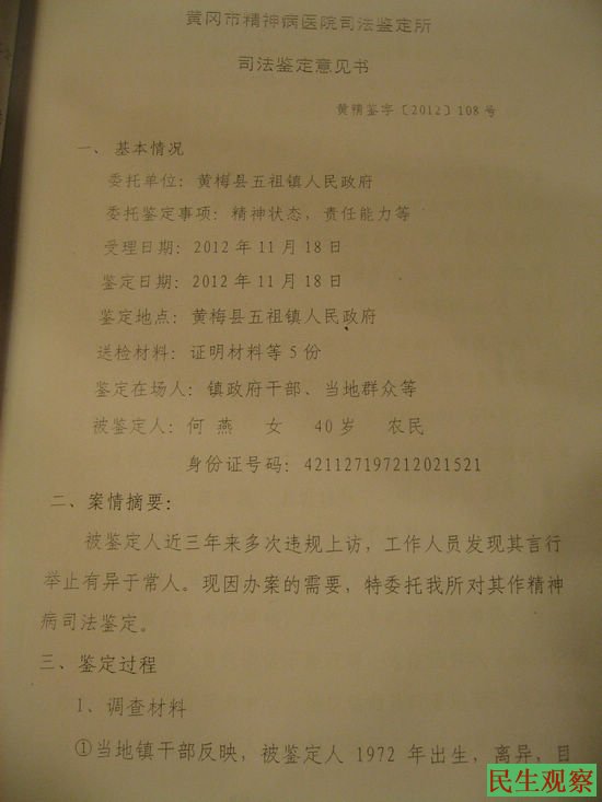 由黄冈市精神病医院司法鉴定所2012年11月18日出具的精神病鉴定说,依据CCMD-3的标准,符合“精神分裂症”(偏执型)的诊断。而这个诊断的结果主要来自于对政府官员、村干部的叙说及何燕以往的情况描述,在接受《本刊》采访时,何燕证实该所并没有对她进行医学的诊断,该所提出的结论也没有形成有效的证据链。