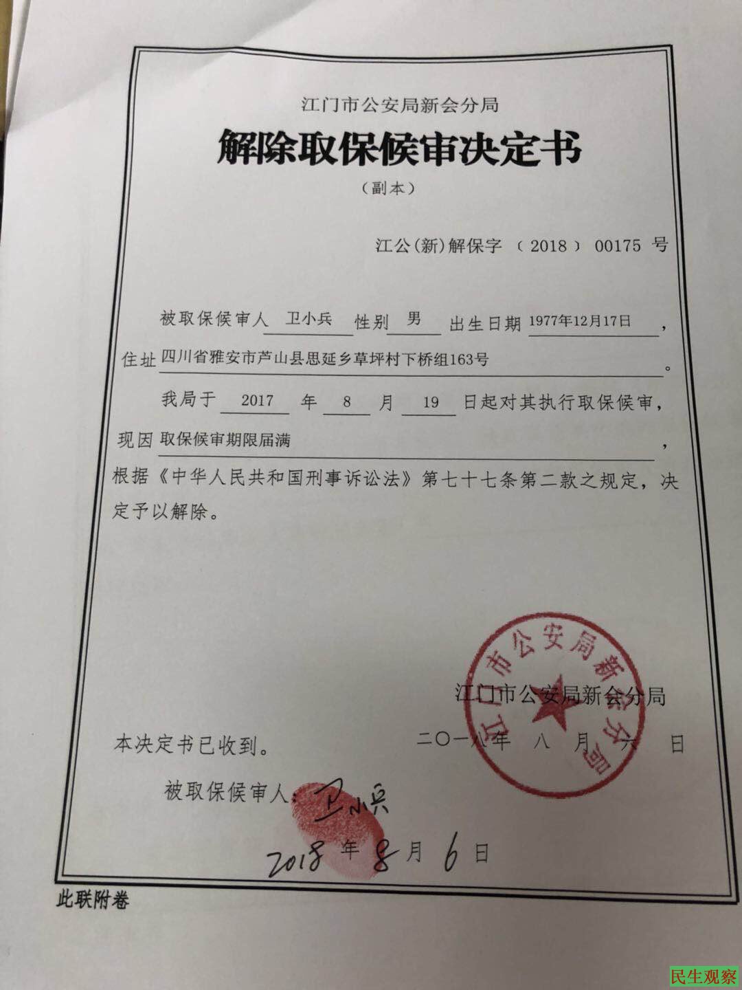 8月17日,“海祭案”首批涉案人之一的卫小兵接获江门市公安局新会区分局国保的电话通知后,前去办理解除取保候审手续的。江门警方对卫小兵进行繁复的个人信息采集,包括采血、指纹、掌纹、全方位拍照等,并在各种材料上签字画押后,才办理完解除取保候审手续,警方向卫小兵提供了《解除取保候审决定书》,自此卫小兵因“海祭案”的刑拘取保一年期限终于结束。