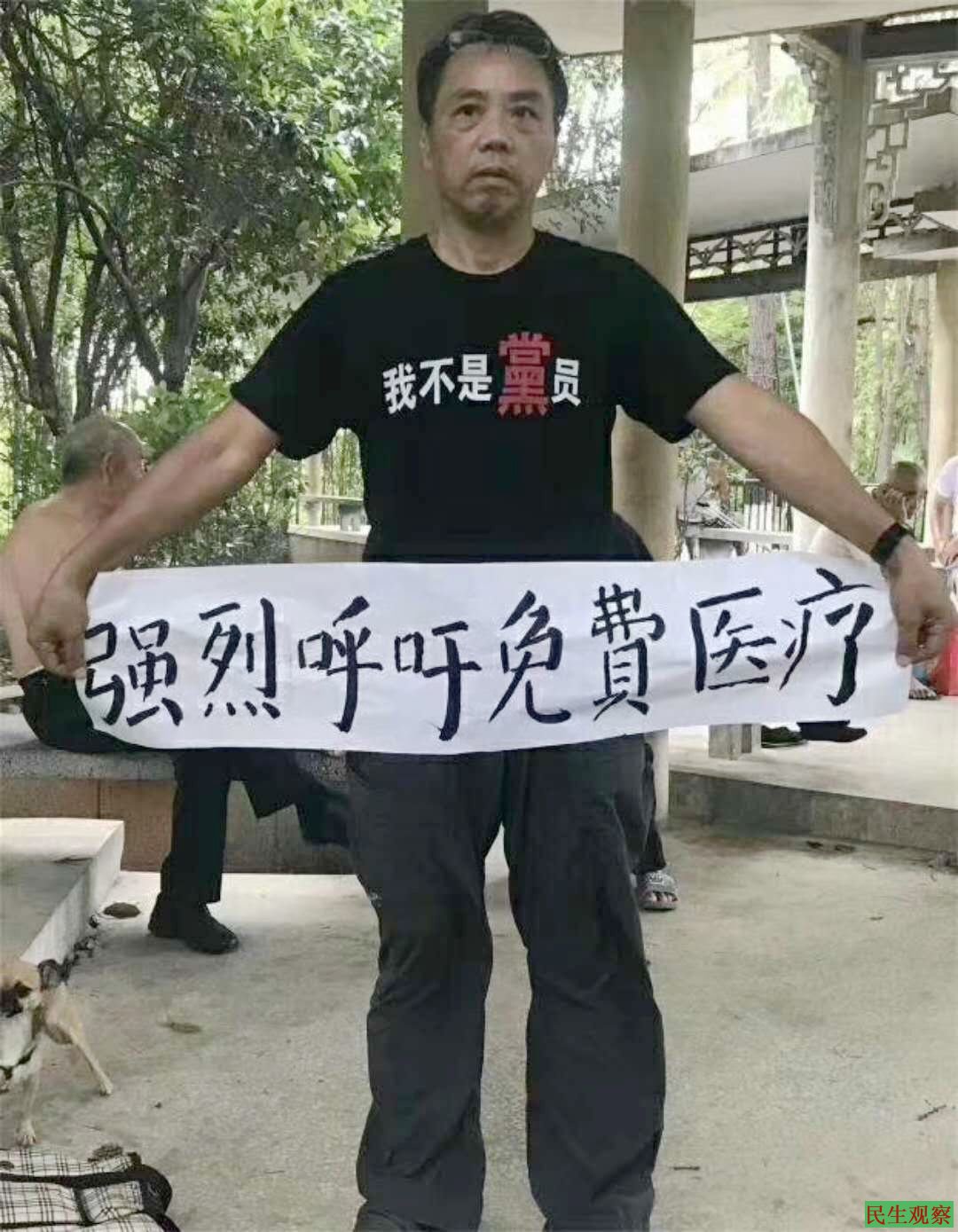 警察告诉他说:“是为你最近在公共场所举牌事”。黄怡剑接着问道:“是举的哪块牌子的事?”警察说:“是强烈呼吁免费医疗的牌子”。