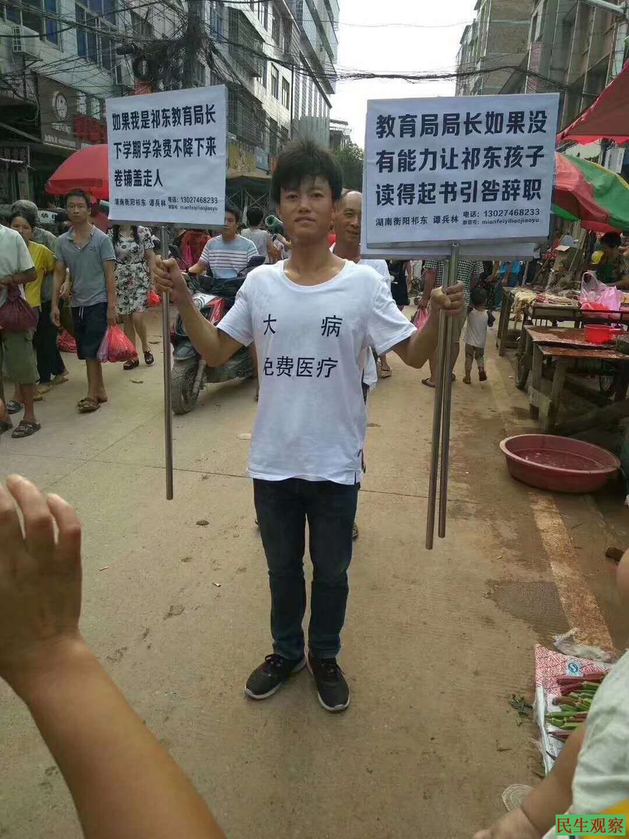 据悉,2018年9月4日早上,谭兵林在老家湖南省祁东县步云桥镇举牌要求民生“三免”,举牌位置分别位于市集中心地段、祁东县政府门口、县人大常委会门口等地,举牌内容包括免费医疗、免费教育、免费养老及其它诉求。