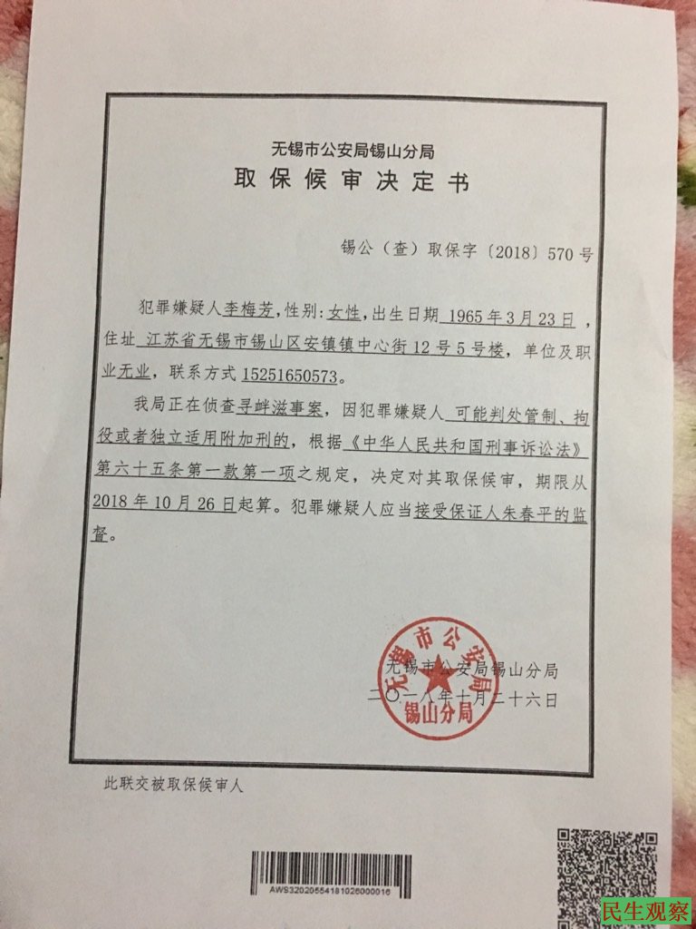 【民生观察2018年10月27日消息】本网获悉,无锡李梅芳、孙静芳、王英华、胡水珍、苏惠娟、朱燕新六名维权人士到北京上访遭北京警方抓捕,无锡驻京办包黑车将六人遣返无锡后,李梅芳随被锡山区分局查桥派出所以涉嫌“扰乱公共秩序”传唤,做笔录关押24小时释放后,深夜警方又追到其家中强行送达了涉嫌“寻衅滋事案”《取保候审决定书》。