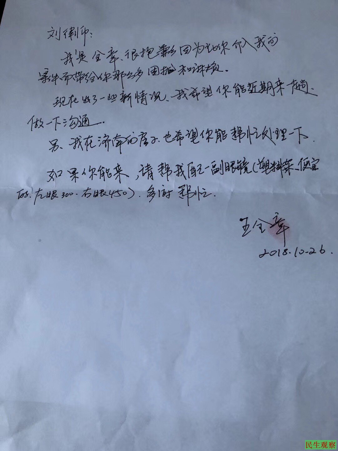 据刘卫国律师展示的一张由王全璋律师亲笔手写的字条显示,王全璋律师告知刘卫国律师,案件出现了新的情况,要求刘卫国律师近期前往天津一看进行沟通。另外,王全璋律师还是字条中请刘卫国律师帮忙对其在济南的房子进行处理,并且要求刘律师去之前帮忙配一副眼镜,字条落款时间为10月26日。刘卫国律师还展示了一张由天津第一看守所手写的”被监管人员亲友送款凭证”,时间是10月31日。