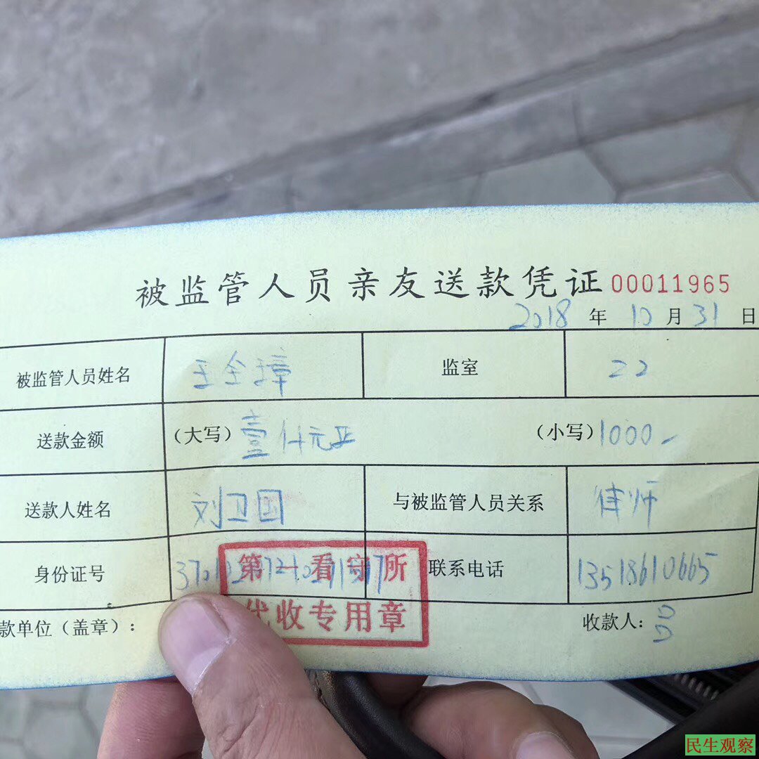 【民生观察2018年11月1日消息】本网获悉,已在10月下旬因个人伤情原因声明退出“709”王全璋案的山东济南刘卫国律师于日前发出消息称继续代理王案,从展示的存款单据来看,刘卫国律师已于10月31日去过羁押王全璋律师的天津第一看守所,但未对王全璋案及会见情况进行披露。