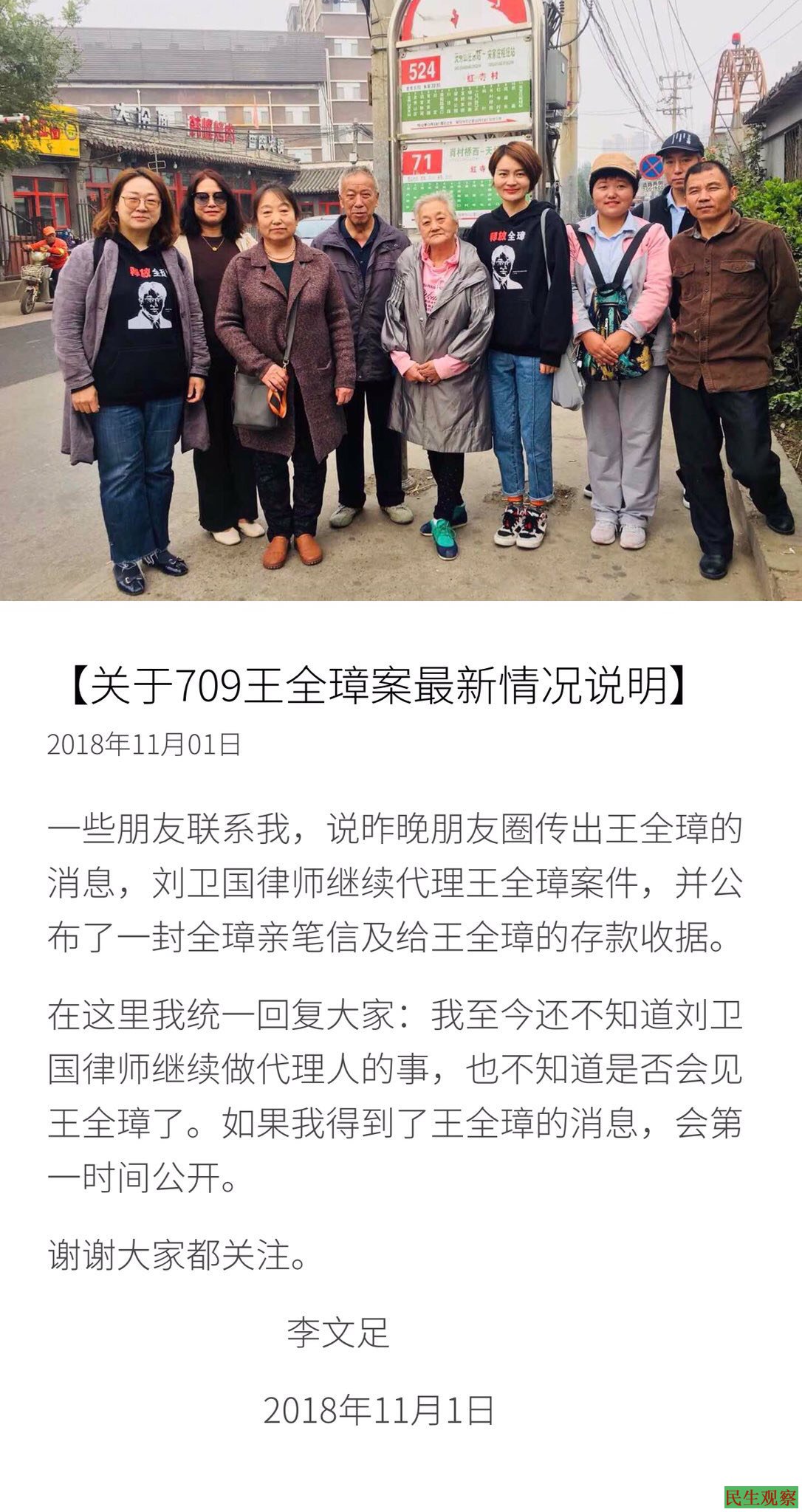 而王全璋律师的妻子李文足女士于11月1日发布情况说明指,通过一些朋友的转达才知道刘卫国律师发布的消息,至今未知刘卫国律师继续代理王全璋案一事,亦未知刘卫国律师这次是否有会见王全璋,并称如果得到有关王全璋的消息就会第一时间公开,同时感谢大家一路以来对王案的关注。