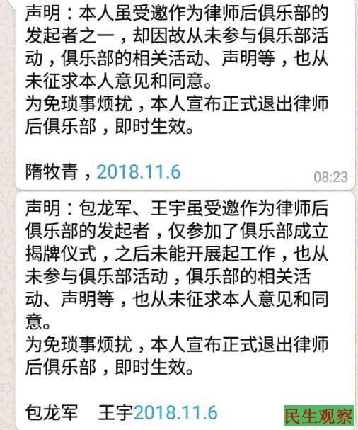 【民生观察2018年11月7日消息】由国内多名”失照律师”组建而成的“中国律师后俱乐部”日前受到当局调查并立案,被要求拆除招牌。多名发起人相继发出声明退出律师后俱乐部,原因不得而知。