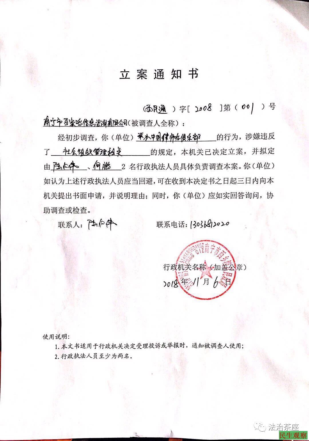 据悉,11月6日,以广西南宁市西乡塘区民政局副局长为首一行十数人去到原“百举鸣律师事务所”现为“百家鸣信息咨询有限公司”的办公地,声称进行“联合执法”行动,除该区民政局副局长之外,联执队伍还包括所属明秀社区居委会工作人员以及唐山路派出所所长等五警,向“百家鸣信息咨询有限公司”送达“立案通知书”,指称“百家鸣公司”举办“中国律师后俱乐部”涉嫌违反“社会组织管理”相关规定,因此立案调查,限期三日之内向西乡塘区民政局
