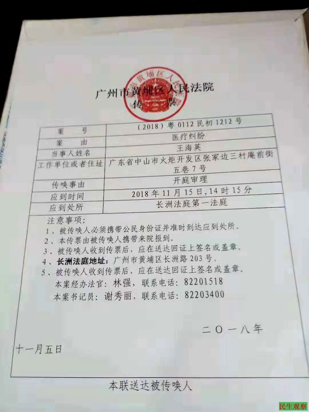 【民生观察2018年11月16日消息】本网获悉,广东省中山市火炬开发区访民王海英被精神病案,11月16日在广州市黄埔区人民法院长洲法庭第一审判庭开庭审理。