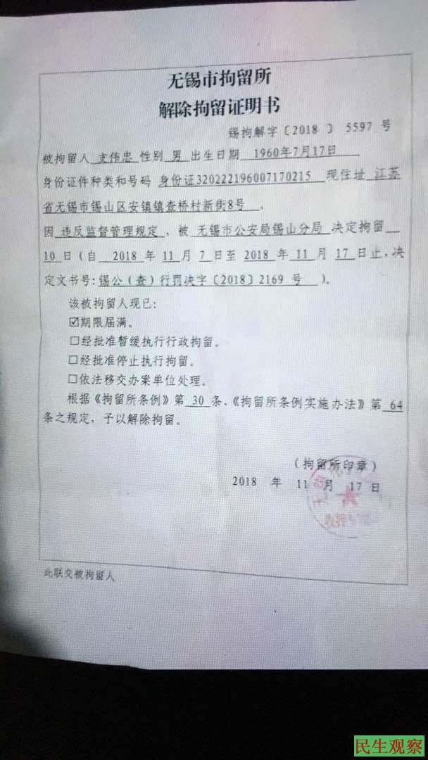 而另一位被截访后拘留的无锡抗强拆维权人士支伟忠,也与倪满良同样的事由被拘,同一时间被解除拘留。