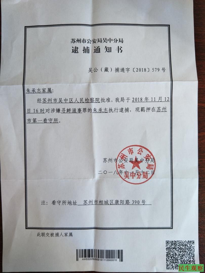 然而,时隔一周,11月19日中午家属终于收到了来自苏州吴中当局送达的《逮捕通知书》中显示:经苏州市吴中区“人民”检察院批准,于2018年11月12日,对涉嫌“寻衅滋事罪”的朱承志执行逮捕,现羁押在苏州市第一看守所。
