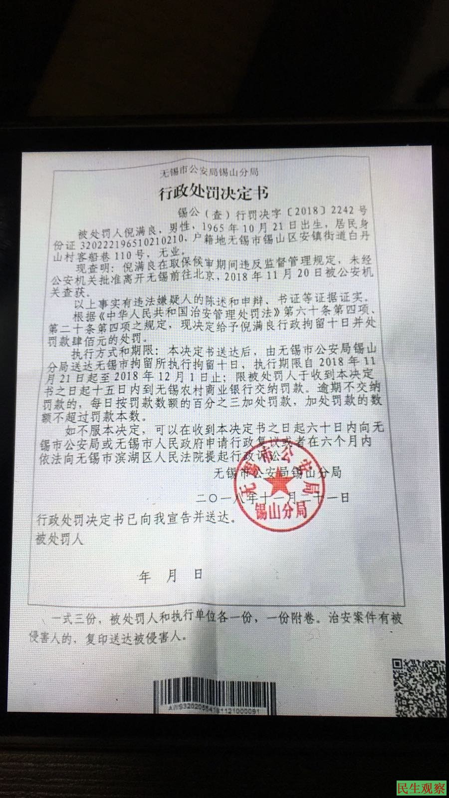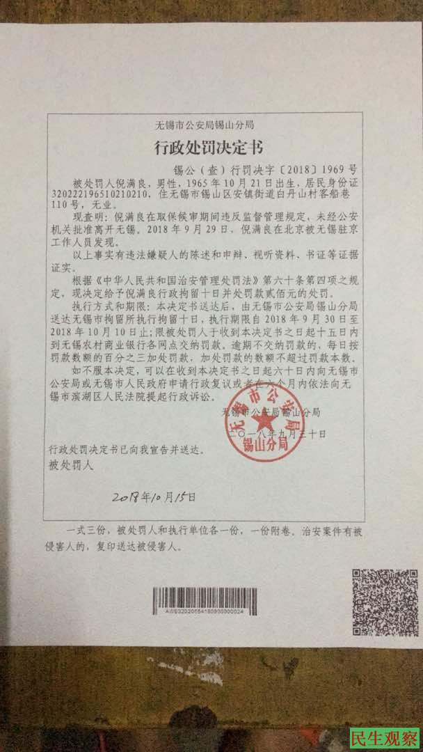 据悉,在上海“进博会”及无锡“双11”国际马拉松期间,无锡多名维权人士被上岗、失踪,无锡抗强拆维权人士倪满良,因本月上旬(11月5日)到北京上访未果,却遭到无锡驻京办截访。11月6日,倪满良被驻京办包租的黑车将送达无锡锡山公安分局查桥派出所后,随即便被查桥派出所宣布《行政拘留》10日。