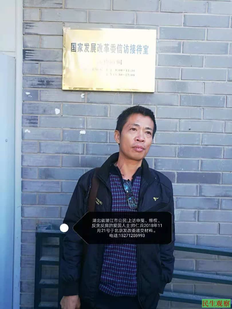 帅仁兵最近一直在北京维权奔波在各大信访窗口,11月29日帅仁兵在北京中南海给中央领导邮递信件被警察拦截查身份证因为身份证被非法注明是访民(特殊身份)人,被北京警察送往马家楼关押,北京设置马家楼就是属于非法关押访民的集中营,马家楼的恐惧让你无法想象,强行带离遣返访民回原住地,手段非常暴力,全部都是各地驻京办工作人员雇佣北京不明身份的人押送回来,有无数访民在遣返中被殴打,有的设置被这些押送人员殴打致伤。帅仁兵被潜江驻京办主任接出马家楼雇佣了3人已经遣返押送回当地的路途上。