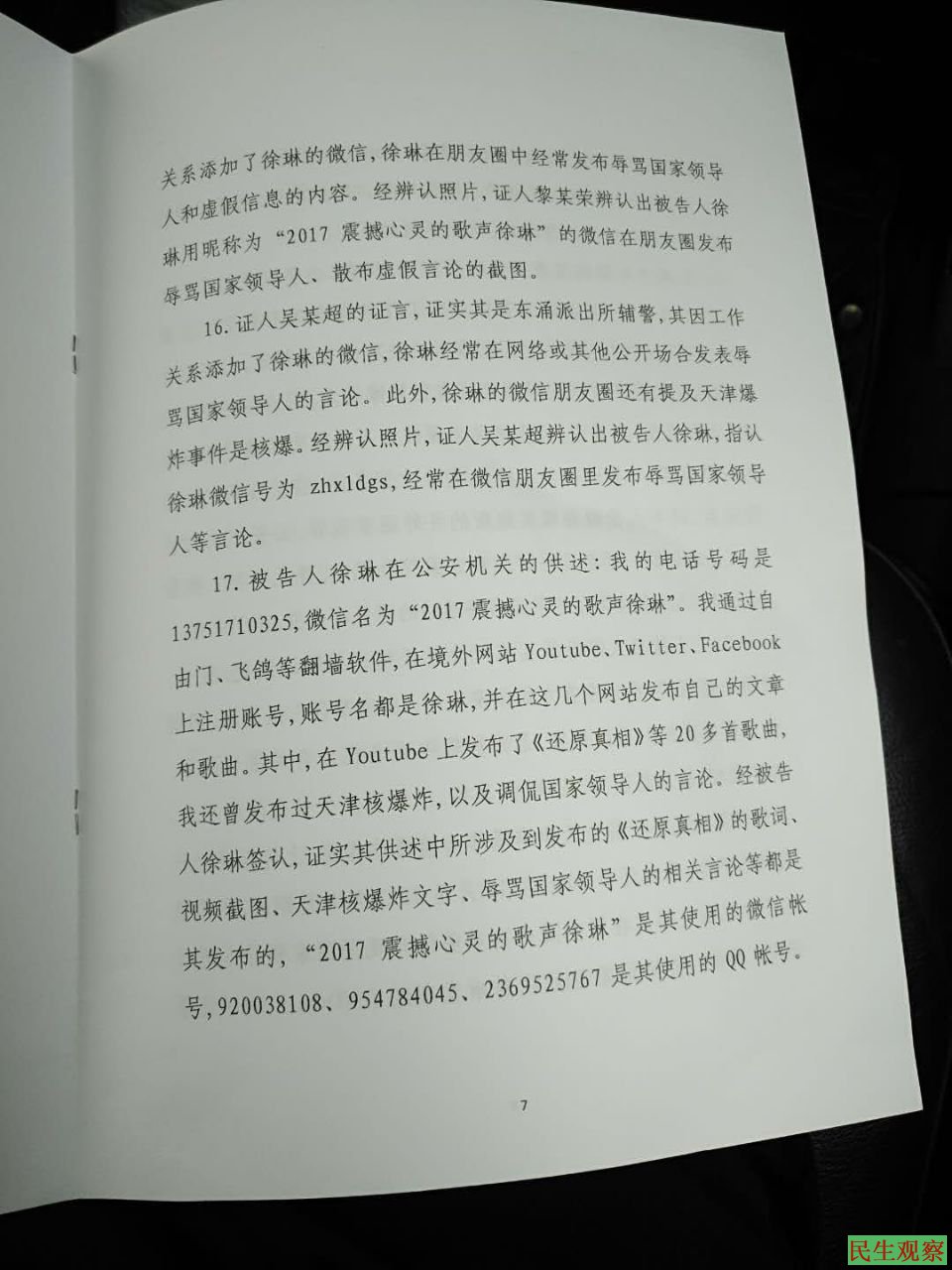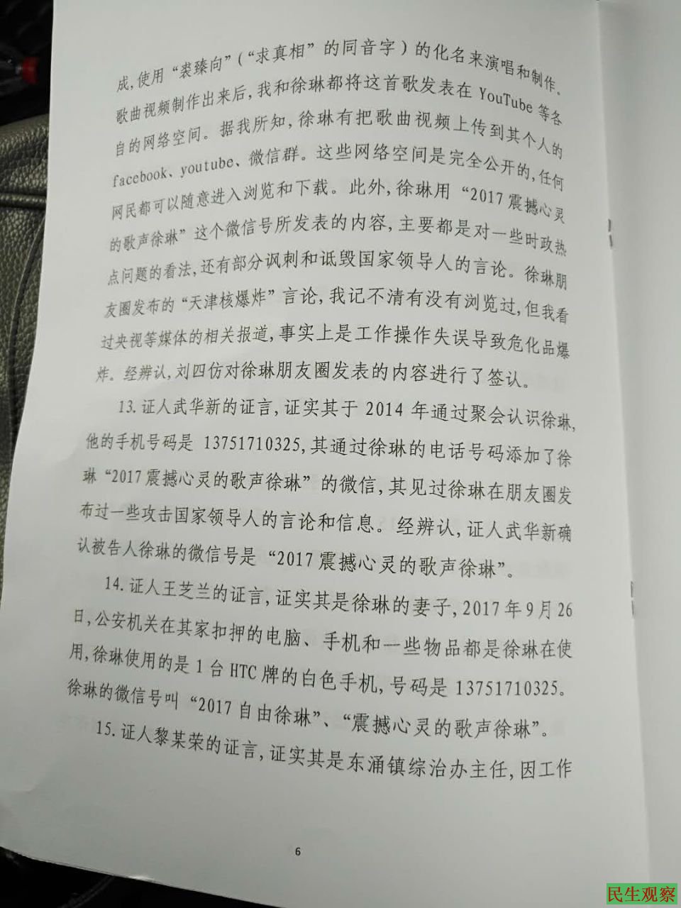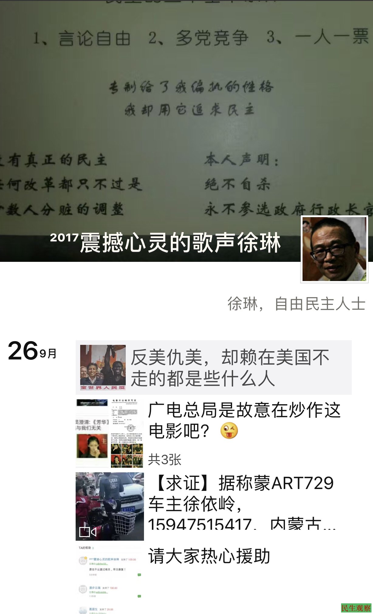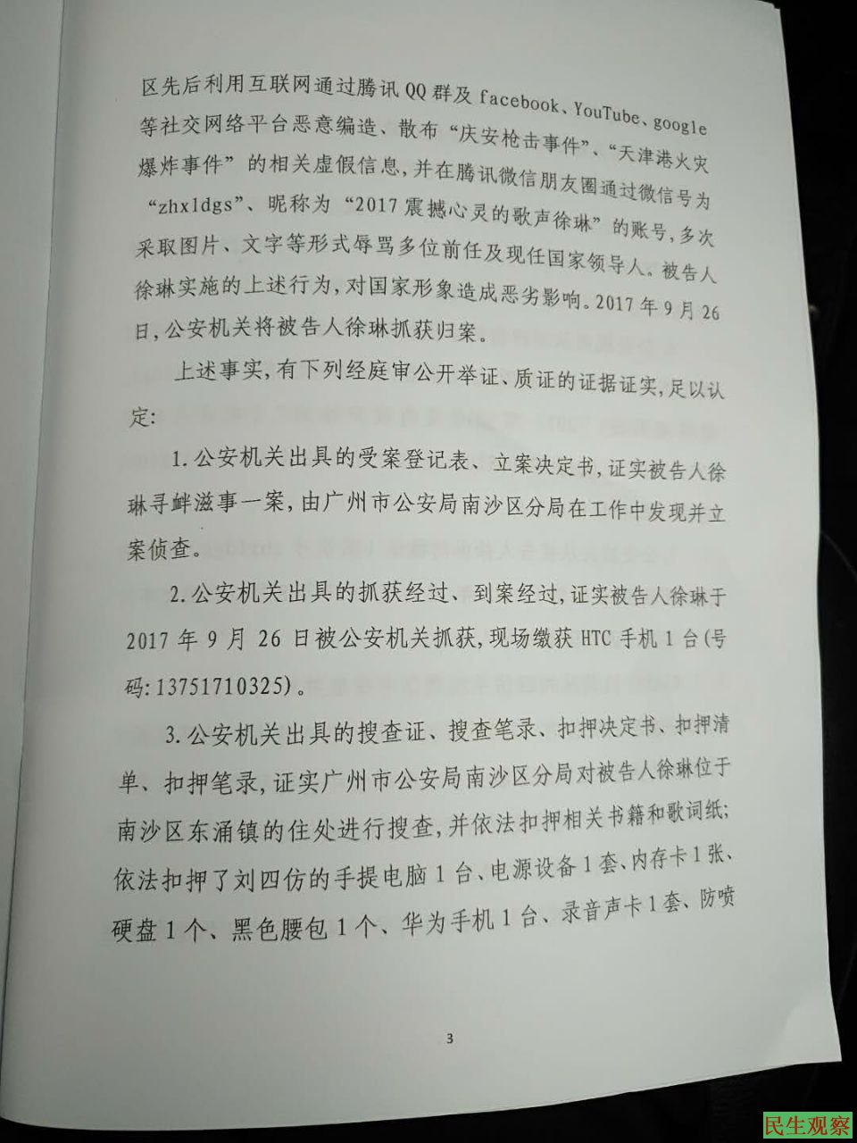 据悉,原籍湖南后移居广州的异议人士徐琳,于2017年9月26日被警方从湖南老家带走刑拘,之后其住所被搜查,警方抄家带走徐琳大量个人物品。次日,与其一起创作歌曲的搭档刘四方也被江西宜春市警方以同样理由抓走。徐琳在被羁押一个多月后,于2017年11月2日被广州市南沙区检察院以“寻衅滋事罪”批准逮捕,后羁押于南沙区看守所。