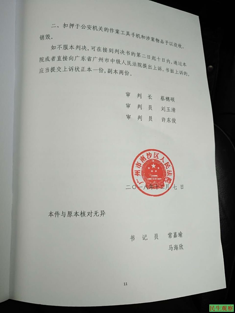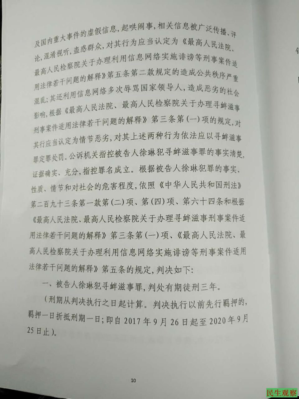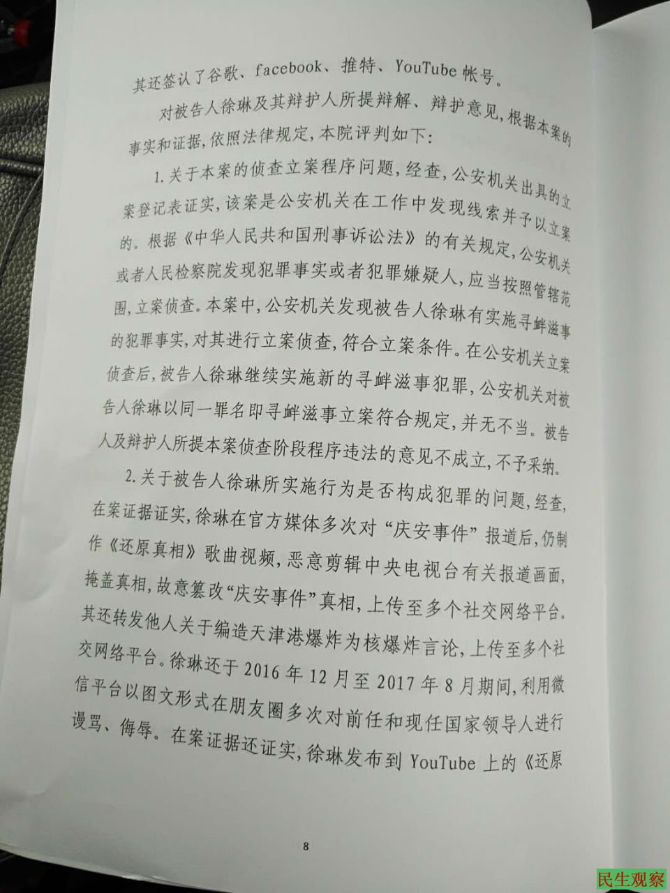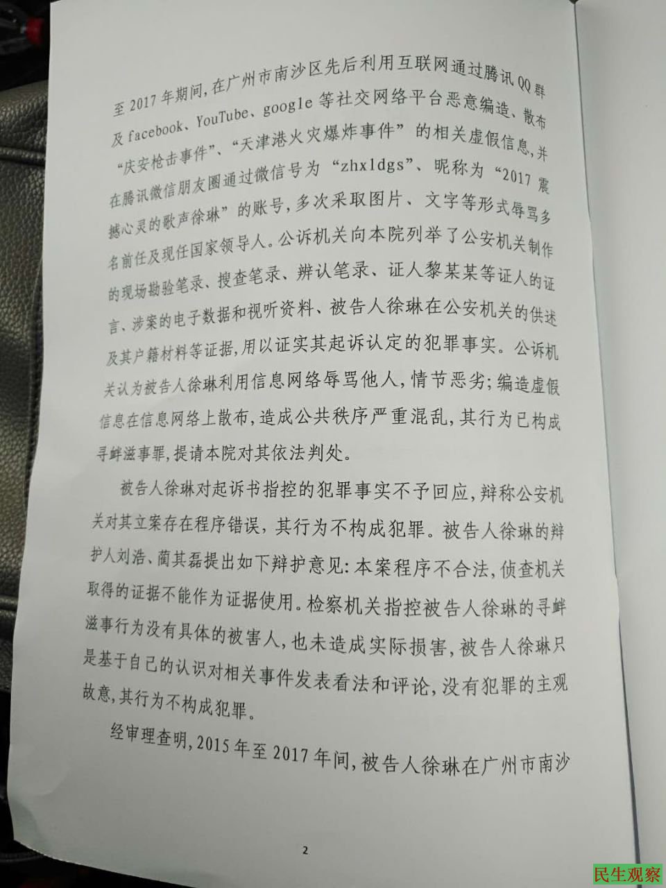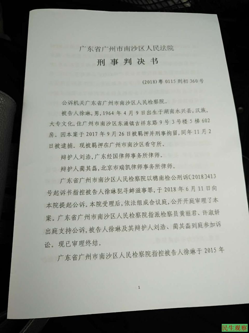 2018年12月7日,徐琳被南沙区法院以寻衅滋事罪判处有期徒刑三年,刑期至2020年9月25日止。