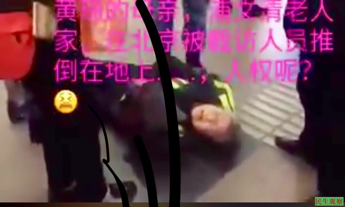 据悉,蒲文清老人12月6日在重庆维权人士危文元等人的陪同下搭乘火车前往北京,于7日晚8点多抵达北京西站,出站时遭遇四川地方政府派出的维稳人员堵截,来人准备带走蒲文清老人,遭到同行朋友的保护而未成事,推撞中维稳人员伺机故意大力推搡黄母,将老人推跌在地。根据同行朋友拍摄的视频可见蒲文清老人被推跌后大声呼救,可幸的是黄母未有大碍,在朋友的搀扶下可以起身走动。