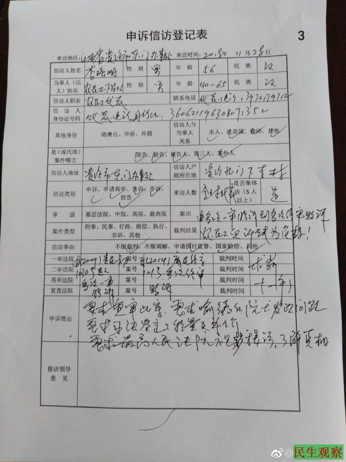 【民生观察2018年12月12日消息】本网获悉,江西农民工李瑶明遭承建单位和包工头恶意欠薪,导致家破人亡背负巨额债务,其依法诉讼维权长达十年至今还是没有得到公平合理的解决。期间,李瑶明还被欠薪方两次报案诬陷其“诈骗罪”而遭警方非法关押一百八十多天。