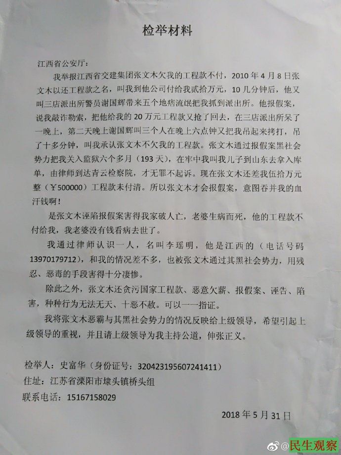 据了解,与李瑶明情况类似的还有一个名叫史富华的江苏人,其在举报信中称,江西省交建集团张文木拖欠其工程款50万元不付,还向派出所报假案诬陷他敲诈勒索,意图吞并他的血汗钱。是张文木诬陷报假案害的他家破人亡,因工程款无法要回,其妻因生病无钱治疗去世了。
