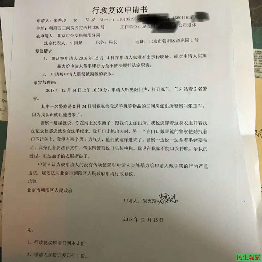 【民生观察2018年12月17日消息】本网获悉,2018年12月14日北京市公安局朝阳分局三间房派出所警察闯进维权人士朱秀玲家中,要给她戴上手铐抓进派出所问话,朱秀玲坚持要警察出示传唤证,警察暴力撕破了朱秀玲的衣服,后朱秀玲以换衣服为由躲进卧室打110报警投诉,警察才离开她家。15日,朱秀玲给朝阳区政府邮寄了行政复议申请书,请求确认朝阳公安局不依法履行法定职责。