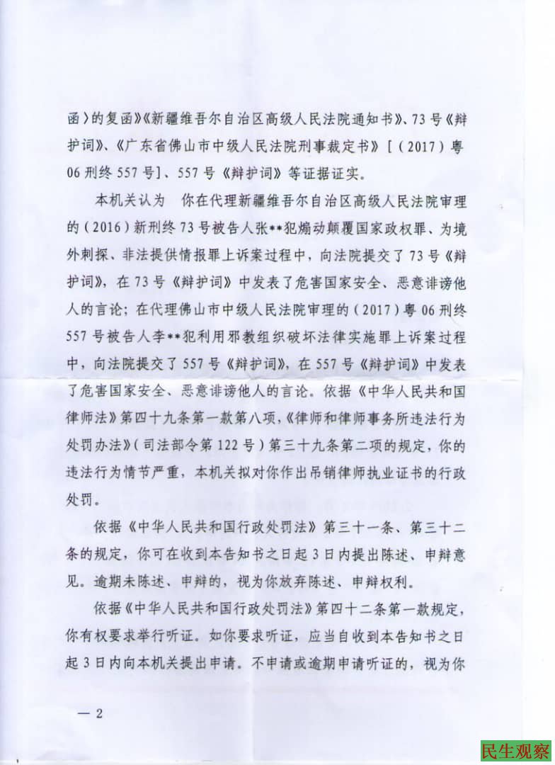 告知书同时表示,刘正清律师可以在三日内提出陈述和申辩意见,逾期将会被视作放弃该项权利。