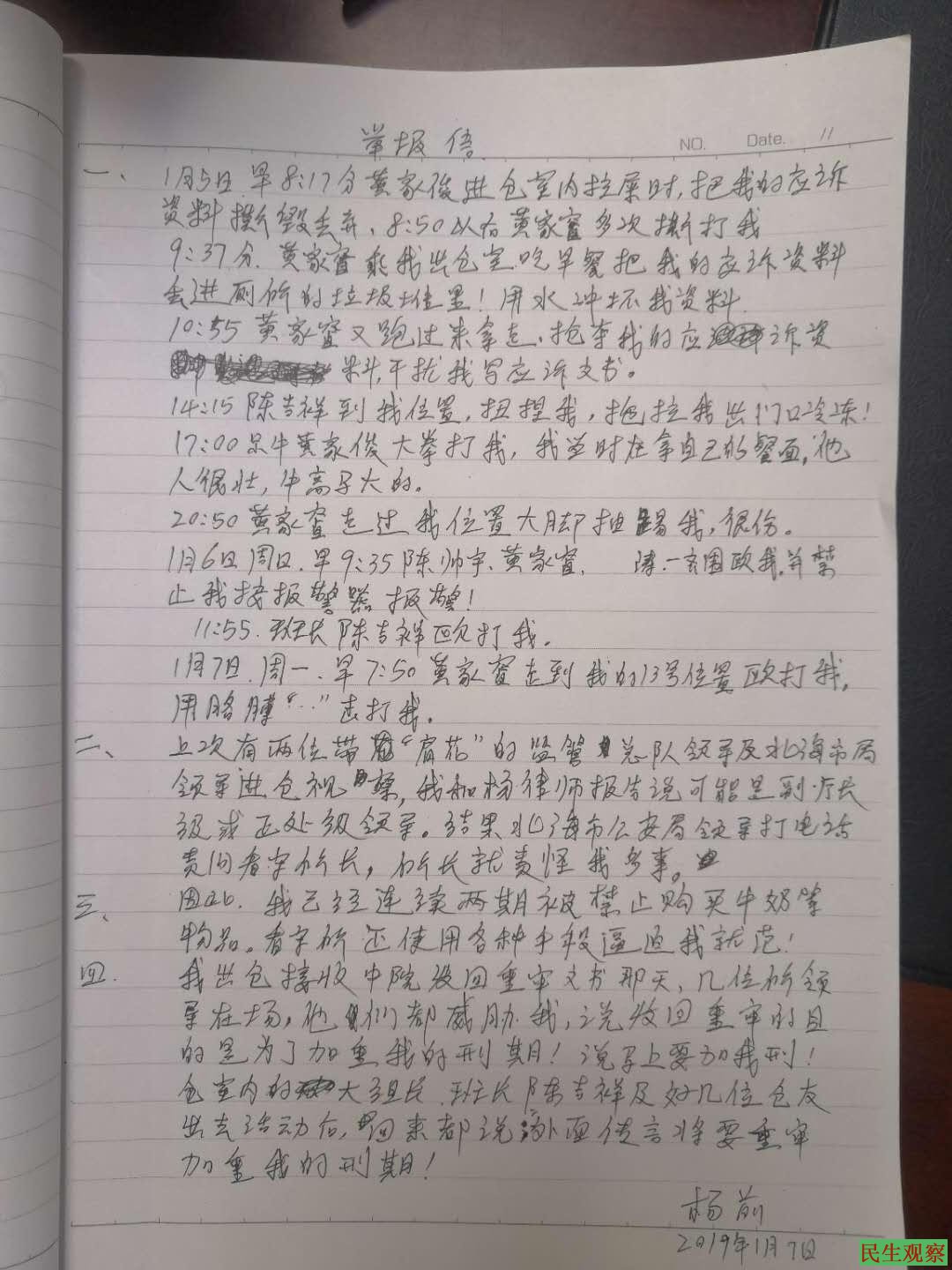 【民生观察2019年1月7日消息】广西合浦县维权人士杨前被控“寻衅滋事罪”遭秘密审判获刑两年,案件后被发回重审。近日,其通过辩护律师再次传出消息,羁押在合浦县看守所的杨前持续受到虐待和殴打,杨前递交多封举报信亦无果。