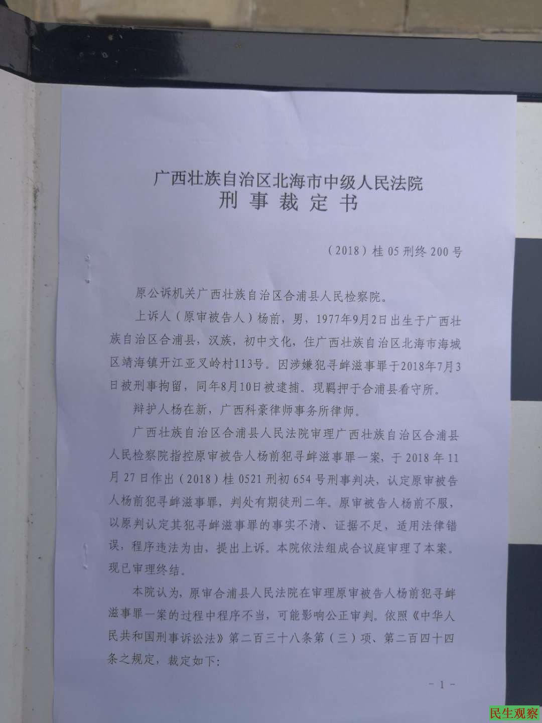 据辩护人杨在新律师介绍,合浦县当局于2018年11月26日在未通知家属和律师的情况下经过秘密审判,判处杨前有期徒刑两年。获得判决结果的杨前以案件“事实不清,证据不足”以及“适用法律错误,程序违法”为由提出上诉,广西北海市中级法院支持当事人杨前提出的上诉意见,于2018年12月25日裁定撤销合浦县法院杨前案的刑事判决,发回合浦县法院重审。