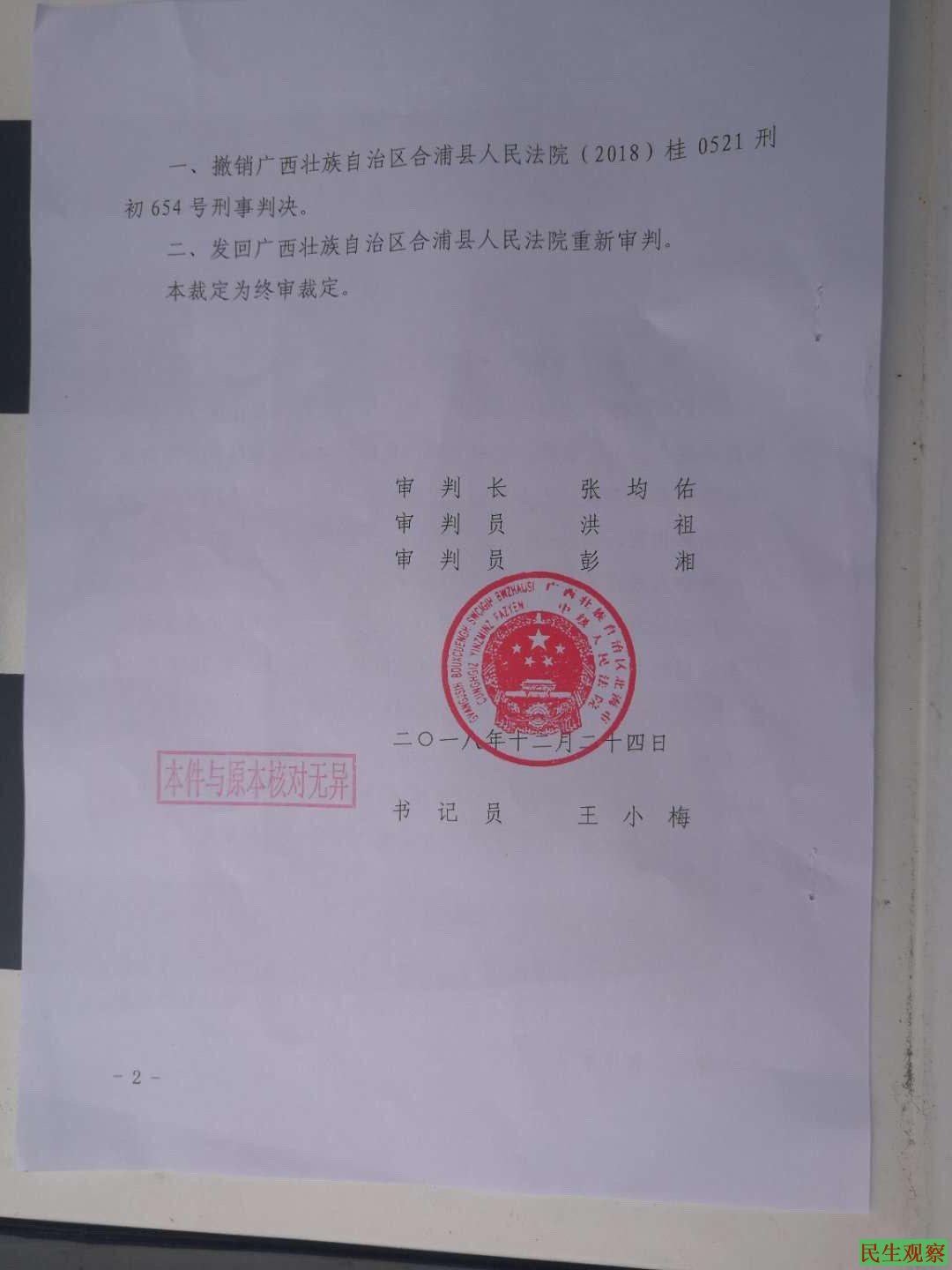 在继续羁押期间,律师又得知杨前在合浦县看守所仍然遭到同仓监犯的虐待殴打,杨前在报警无果后向驻所检察官报告也不予受理,为此杨前多次写信向北海市司法机关予以投诉。在律师和朋友们的多方关注努力下,2018年12月24日北海市中级人民法院依法撤销合浦县法院作出的刑事判决,并发回合浦县法院重审。